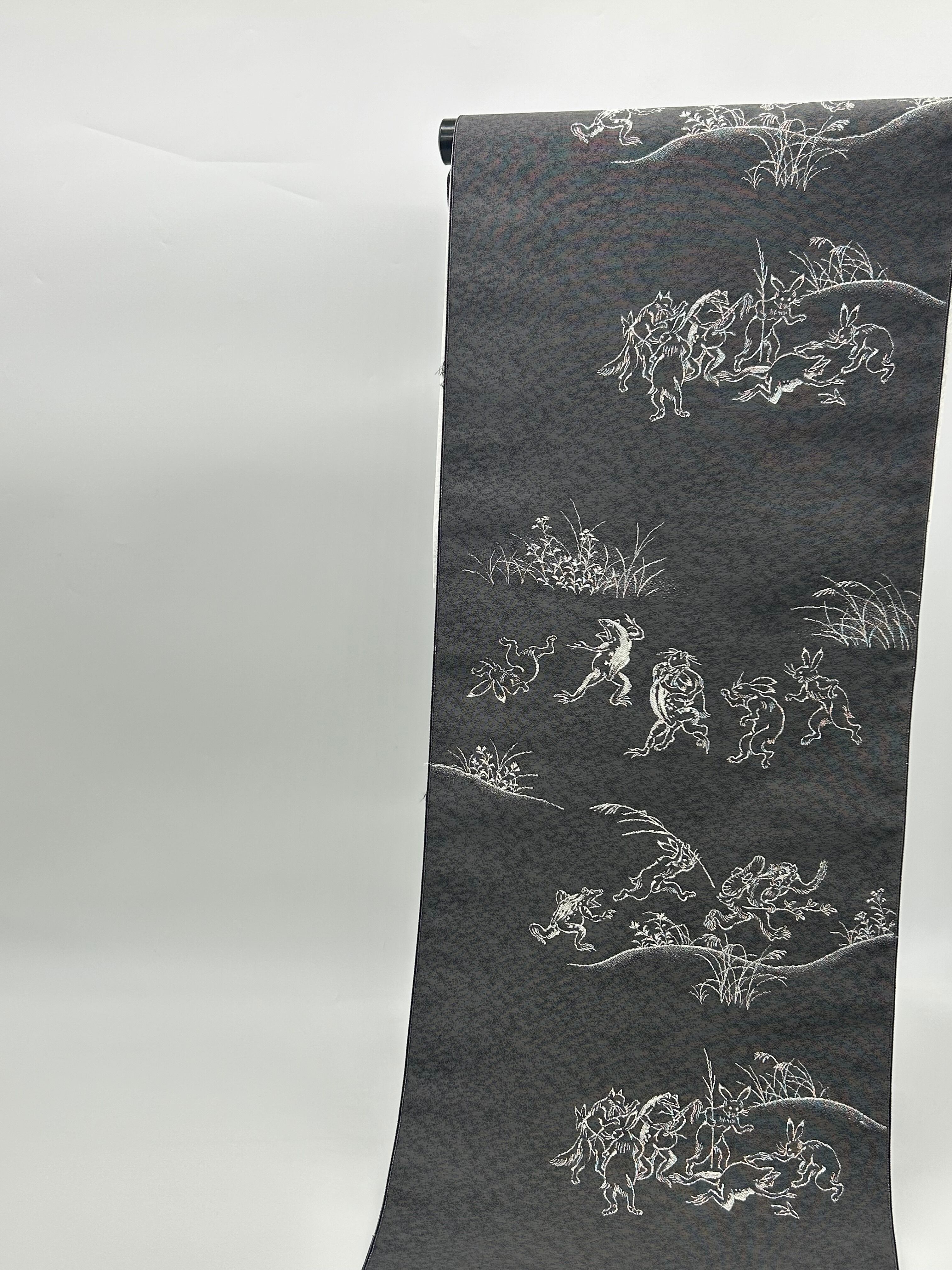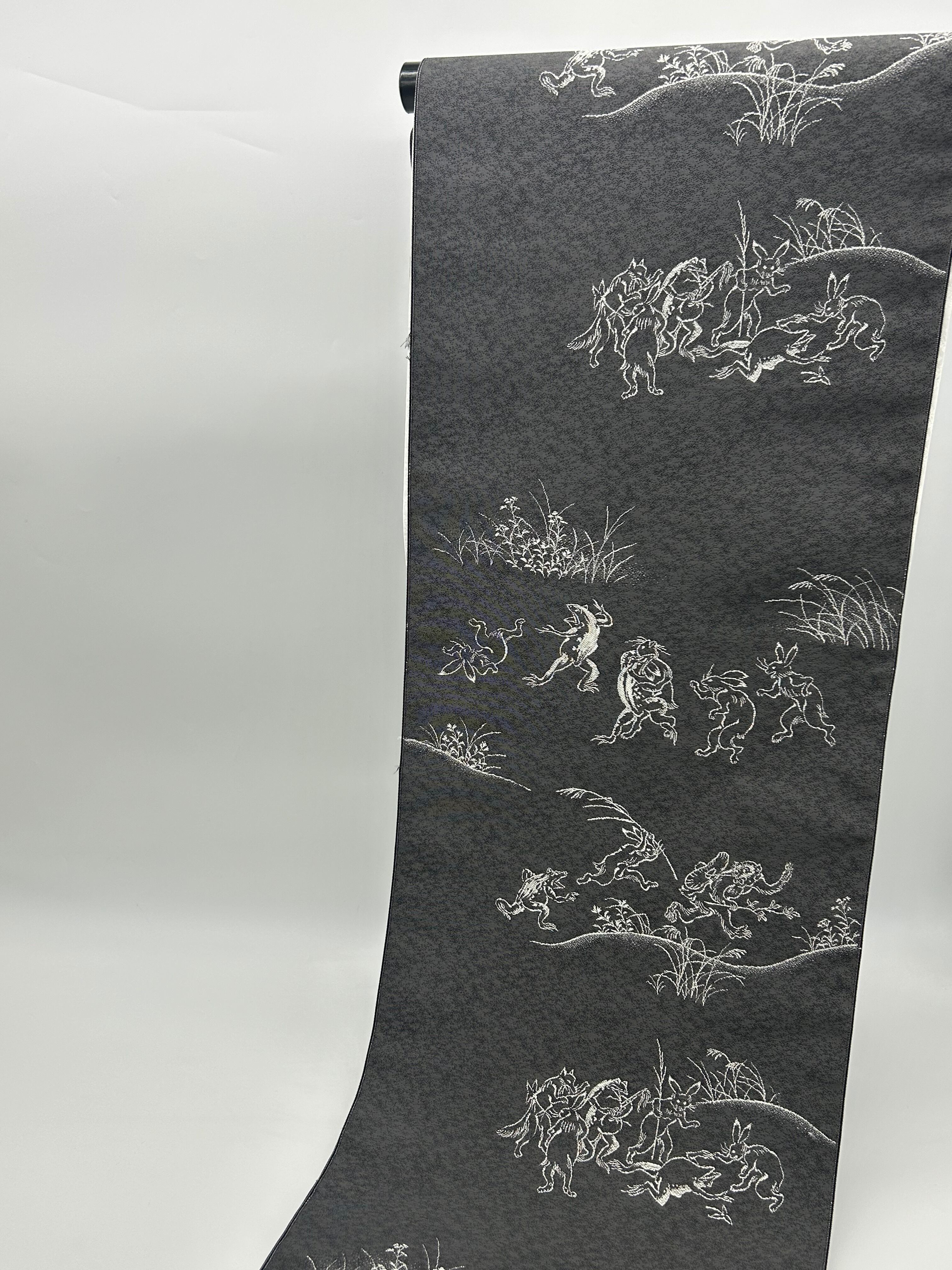 墨色地に鳥獣戯画図が描かれた名古屋帯(袷用)。
