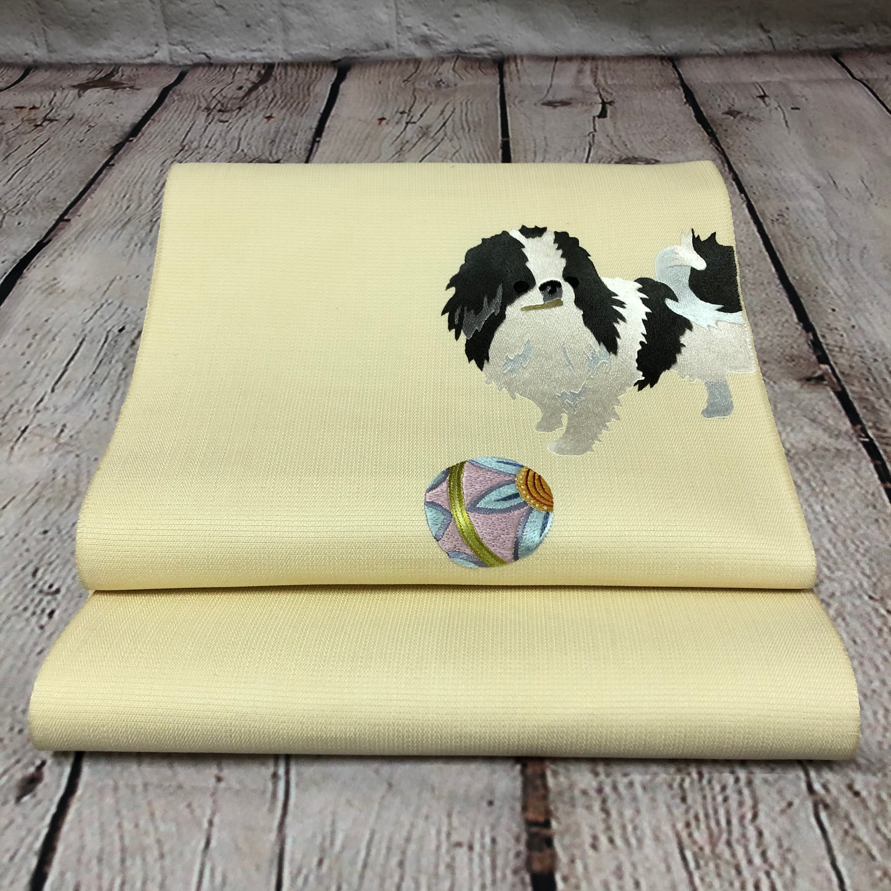 お太鼓に犬(狆)の刺繍が入った八寸名古屋帯。